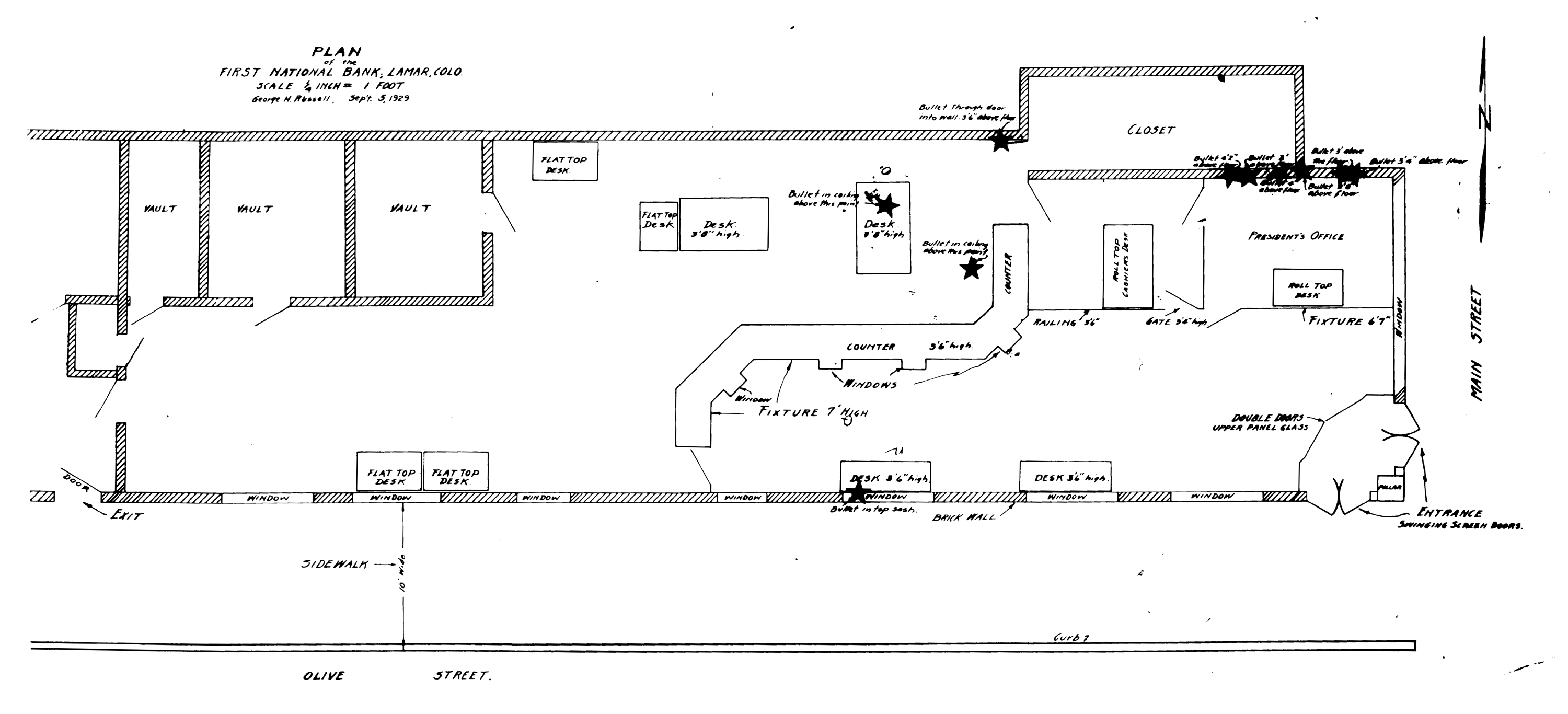 Shots in the bank had been heard by Cashier Harry L. Hooker, of the Valley State Bank across the Main Street intersection. He ordered his front door locked and the vault locked. He leapt to the phone and called Prowers County Sheriff Lloyd E. Alderman, who was at home having lunch. "They want you at the First National. There seems to be trouble down there," the sheriff was told.